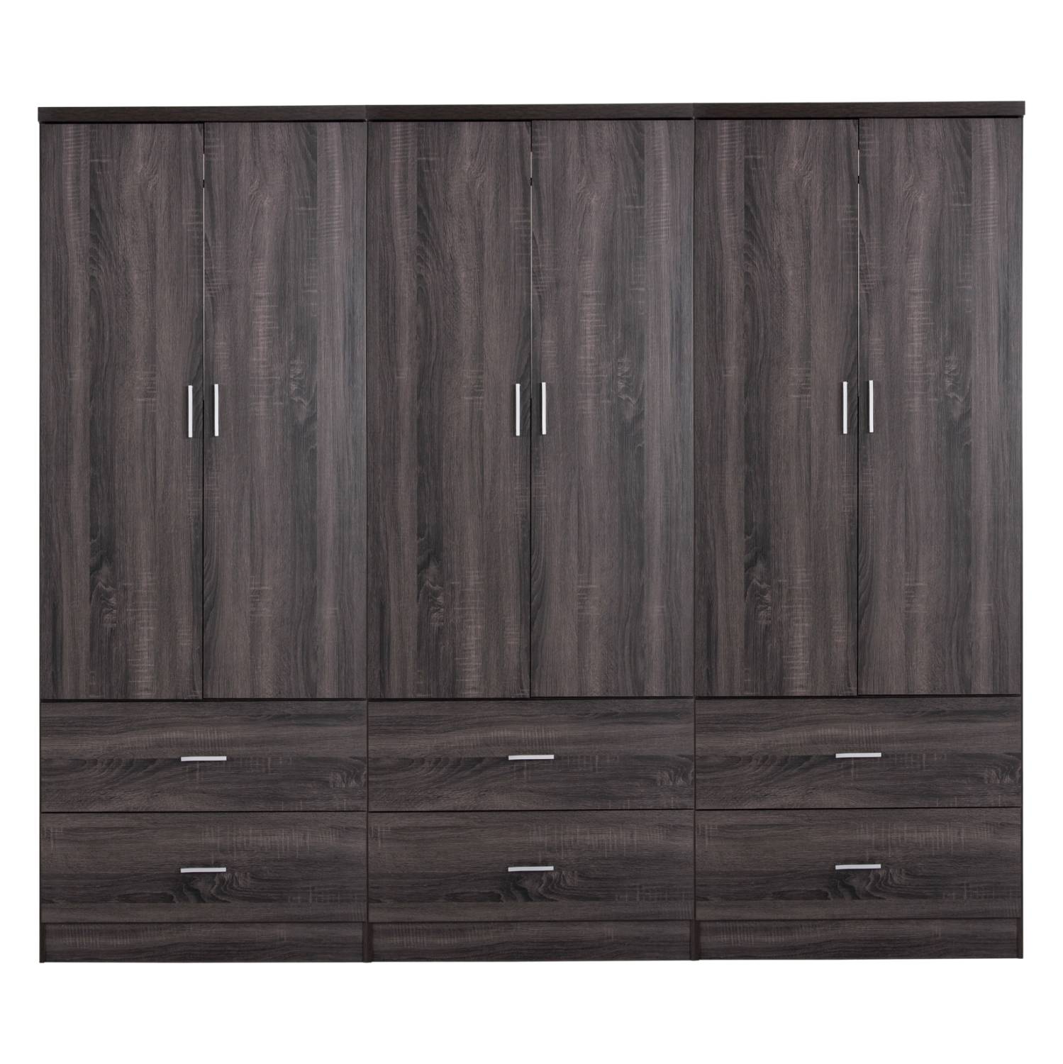 Γνωρίστε την 6-φυλλη ντουλάπα-γκαρνταρόμπα REINA. Πρόκειται για μια μεγάλη ντουλάπα με 6 πόρτες, και στο εσωτερικό της υπάρχει μόνο μια INOX μπάρα για κρέμαση ρούχων. Κάτω ακριβώς από τον χώρο της γκαρνταρόμπας υπάρχουν και 6 ευρύχωρα συρτάρια. Οι πόρτες αλλά και τα συρτάρια ανοίγουν με καλαίσθητα ασημί χερούλια. Είναι κατασκευασμένη από μελαμίνη σε ΑΝΘΡΑΚΙ χρώμα και αισθητικά μπορεί να ταιριάξει με πολλά άλλα στυλ, χάρη και στις «καθαρές» γραμμές της.